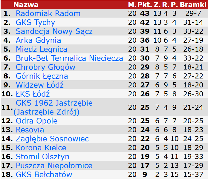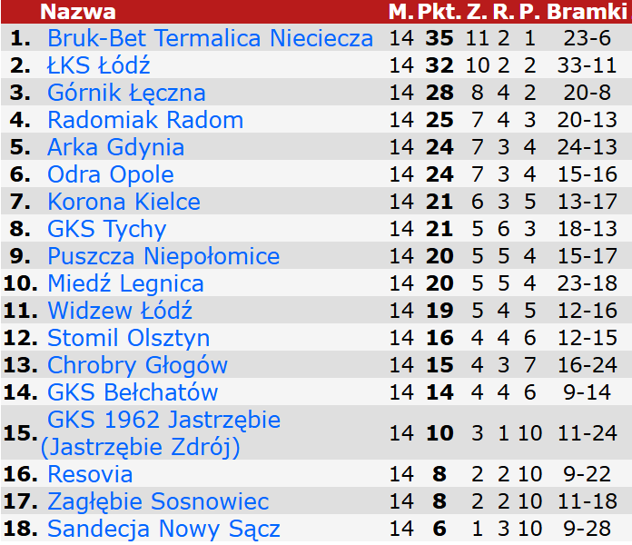 | 12 | ŁKS | 16 | 6 | 3 | 7 | 24 | 26 | -2 | 21 |