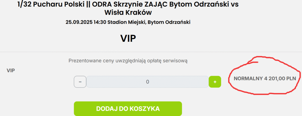 Aktualizacja: Zadzwoniłem do Piotra Michalewicza, prezesa Odry by dowiedzieć się na jakie atrakcje może liczyć delikwent, który zapłaci za bilet 4201 złotych. Okazało się, że tak naprawdę trybuna VIP-owska jest już zabukowana (50 miejsc, a 150 chętnych – między innymi władze Bytomia Odrzańskiego będą licznie reprezentowane) więc cena ma nieco odstraszać. – A jak znajdzie się jakiś wariat, który tyle zapłaci to oczywiście powitamy go z otwartymi rękami – mówi Piotr Michalewicz.